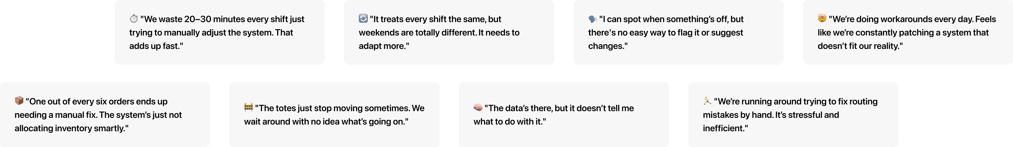 Small inefficiencies quickly compounded across the warehouse floor. Manual adjustments could take 20–30 minutes per shift, forecasting errors increased dwell and travel times, and nearly 15% of orders required last-minute intervention.